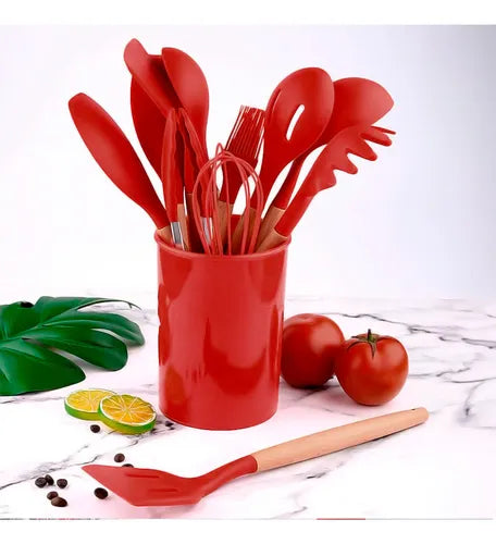 Kit Utensílios Silicone para Cozinha Premium 12 Peças Descrição do produto: Traga estilo e requinte para sua cozinha. Nosso kit Premium em silicone possui todos os utensílios que você pode precisar ao realizar seus preparos na cozinha. Kit composto de peças sofisticadas de fácil operação, de segurança e confiabilidade. Cada um dos utensílios que compõem o conjunto tem um orifício na alça para pendurar corretamente quando não estiver em uso. O material é de alta qualidade com cabo em bambu e silicone resistente a altas temperaturas, diferente dos utensílios de plástico encontrados em lojas gerais, que derretem facilmente. Nosso kit oferece mais durabilidade, design e beleza para sua cozinha.